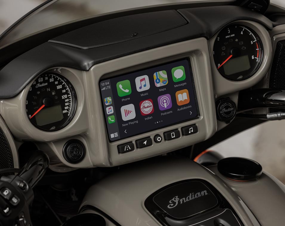 | Infotainment | Ride Command med 7-tums pekskärm: 7-tums display med klocka, lufttemperatur, riktning, display för ljudanläggning; Bluetooth-status för telefonoch headset; fordonsstatus (däcktryck, voltmätare, motortimmar, oljebyte); motorifo (hastighet, bränslenivå, varvtal, växelläge); aktuella fordonsdata; distans, körtid, ankomsttid, altitud); tripmätare; körlägesindikator; skärmljusstyrka; felavläsningsdisplay; Apple CarPlay-integrering. |